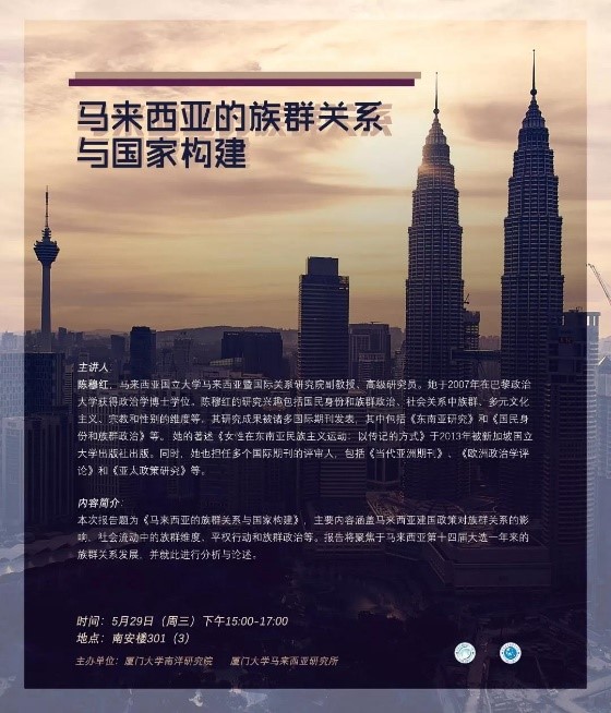 1. 我所于5月29日在厦门大学南洋研究院举办题为《马来西亚族群关系与国家构建》学术讲座,讲座邀请马来西亚国立大学(UKM)马来西亚暨国际关系研究院(IKMAS)副教授、高级研究员陈穆红(Helen Ting)老师担任主讲。详情参见下图及链接:https://mp.weixin.qq.com/s/8MDkj-lvOINAtJ_T0AYdKw