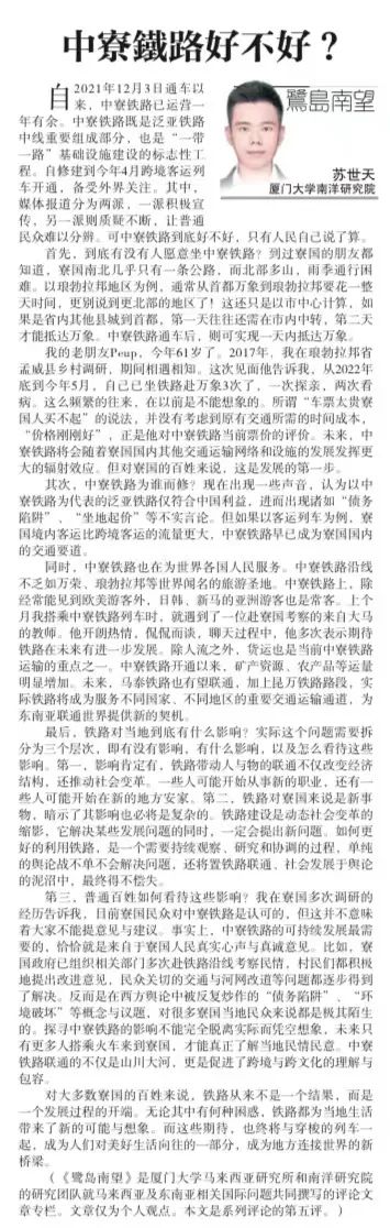 【星洲日报】《鹭岛南望》专栏:苏世天|中老铁路好不好?