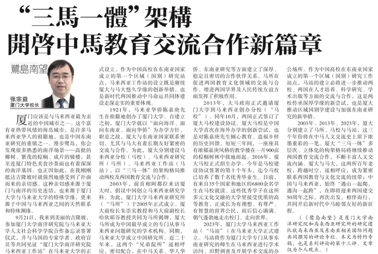 【星洲日报】《鹭岛南望》专栏:张宗益 | “三马一体”架构 开启中马教育交流合作新篇章