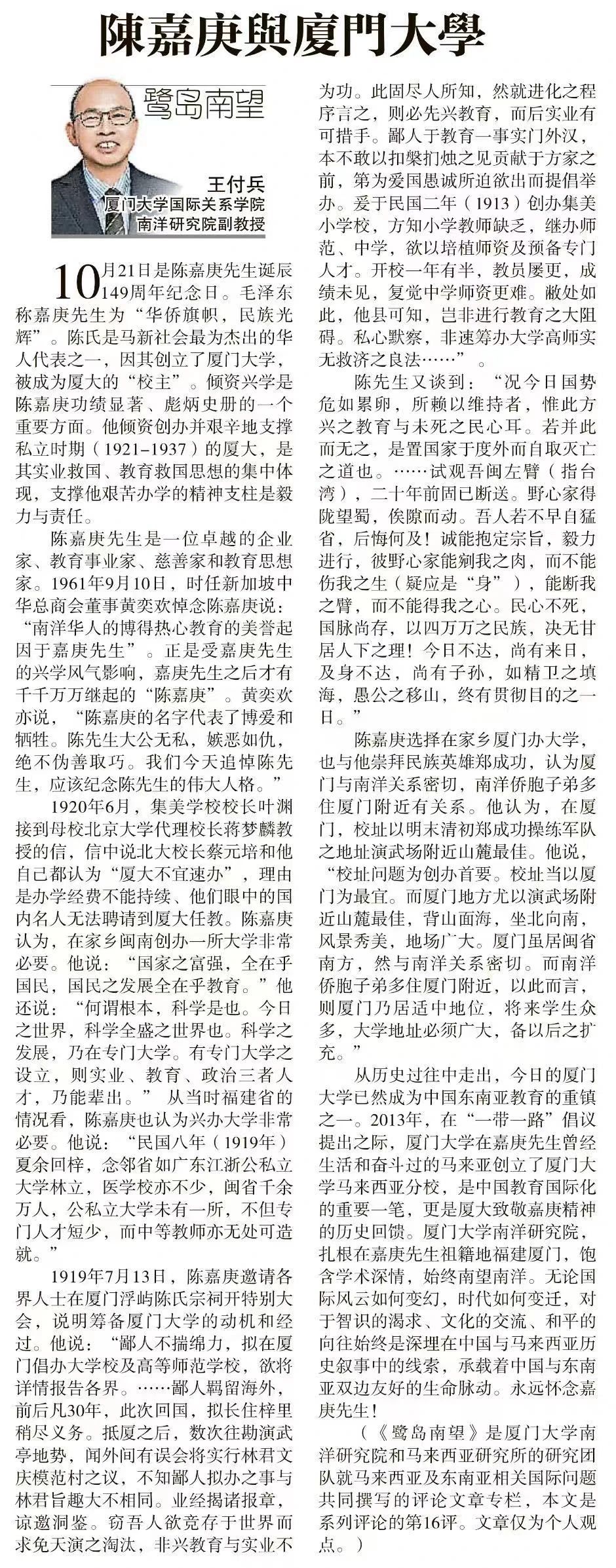 【星洲日报】《鹭岛南望》专栏:王付兵 | 陈嘉庚与厦门大学