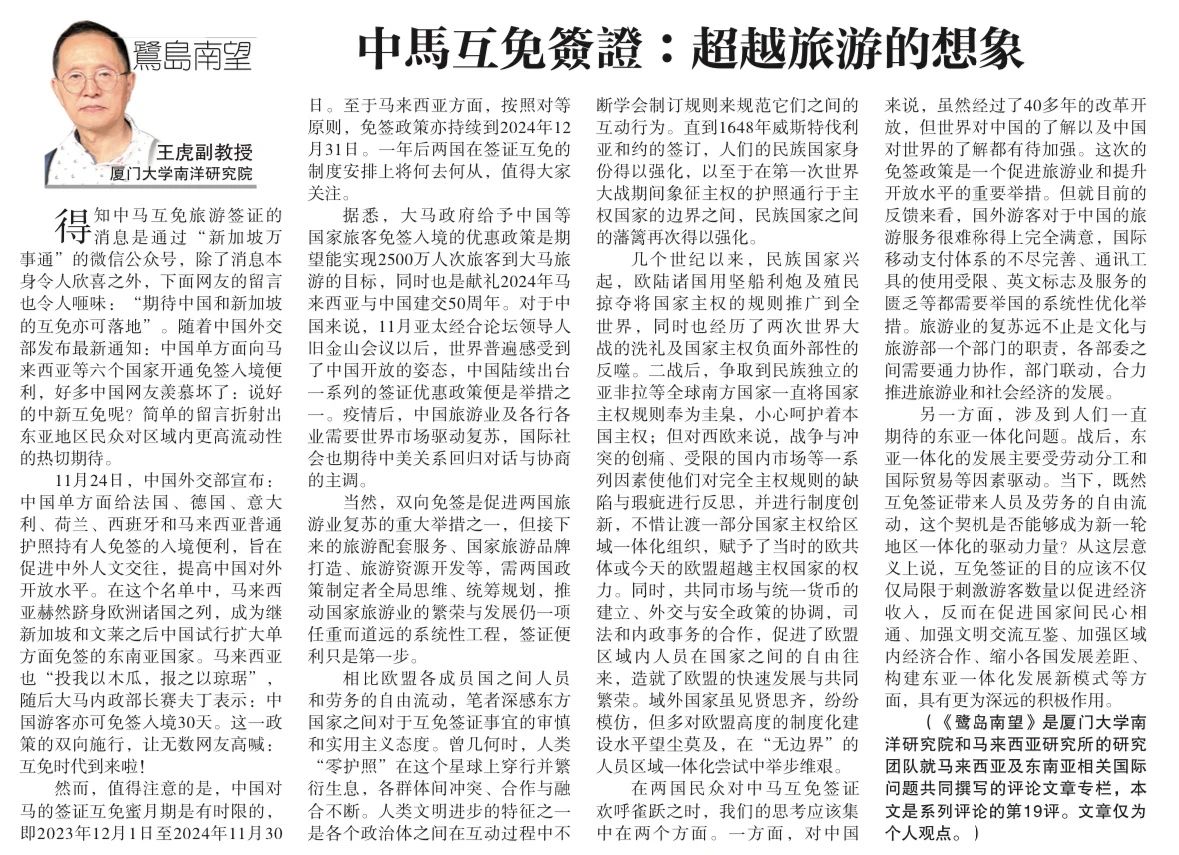 【星洲日报】《鹭岛南望》专栏:王虎 | 中马互免签证:超越旅游的想象