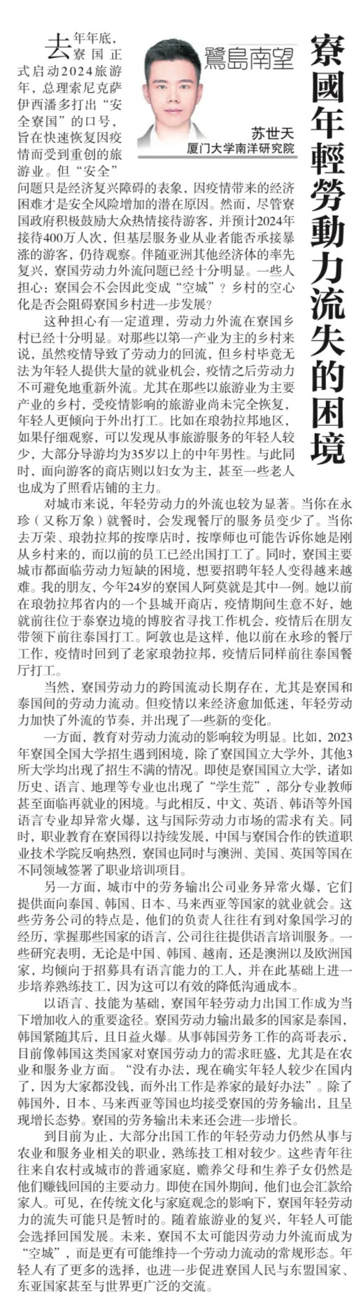 【星洲日报】《鹭岛南望》专栏:苏世天 | 寮國年輕勞動力流失的困境