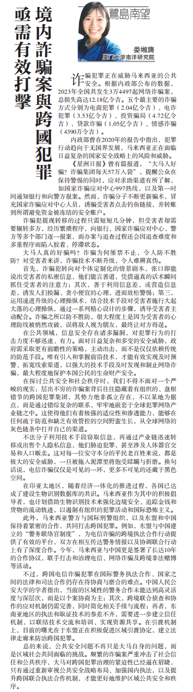 【星洲日报】《鹭岛南望》专栏:娄缃旖 | 亟需有效打击境内诈骗案与跨国犯罪