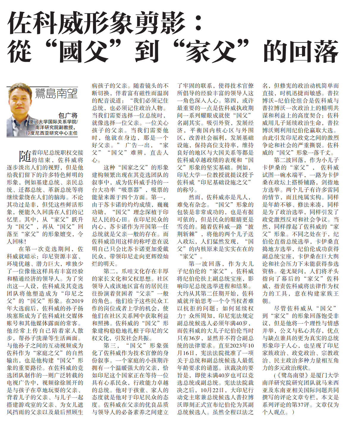 【星洲日报】《鹭岛南望》专栏:包广将|佐科威形象剪影:从“国父”到“家父”的回落