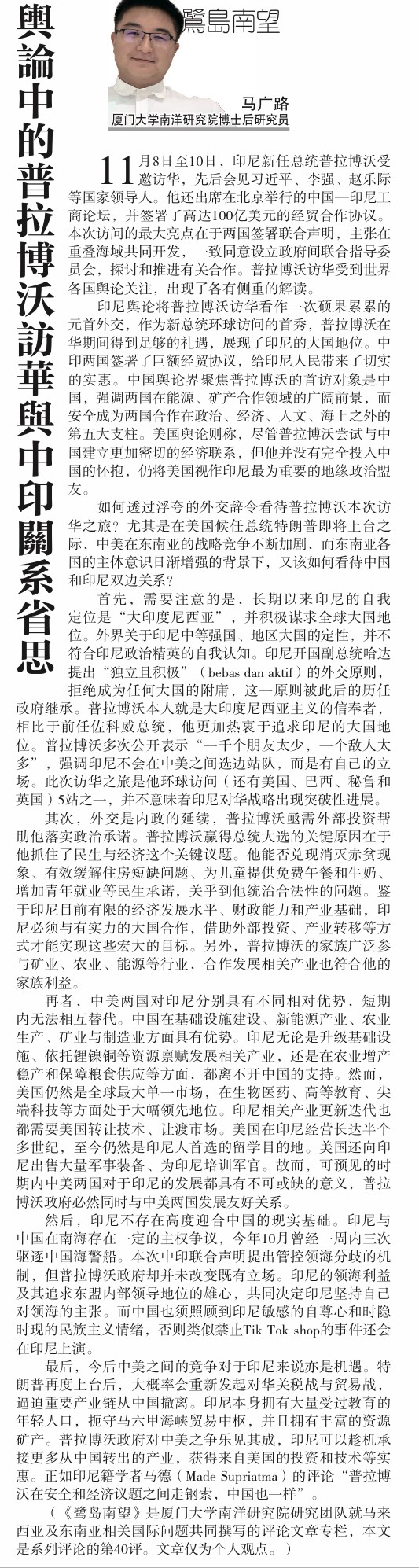 【星洲日报】《鹭岛南望》专栏:马广路|舆论中的普拉博沃访华与中印尼关系省思