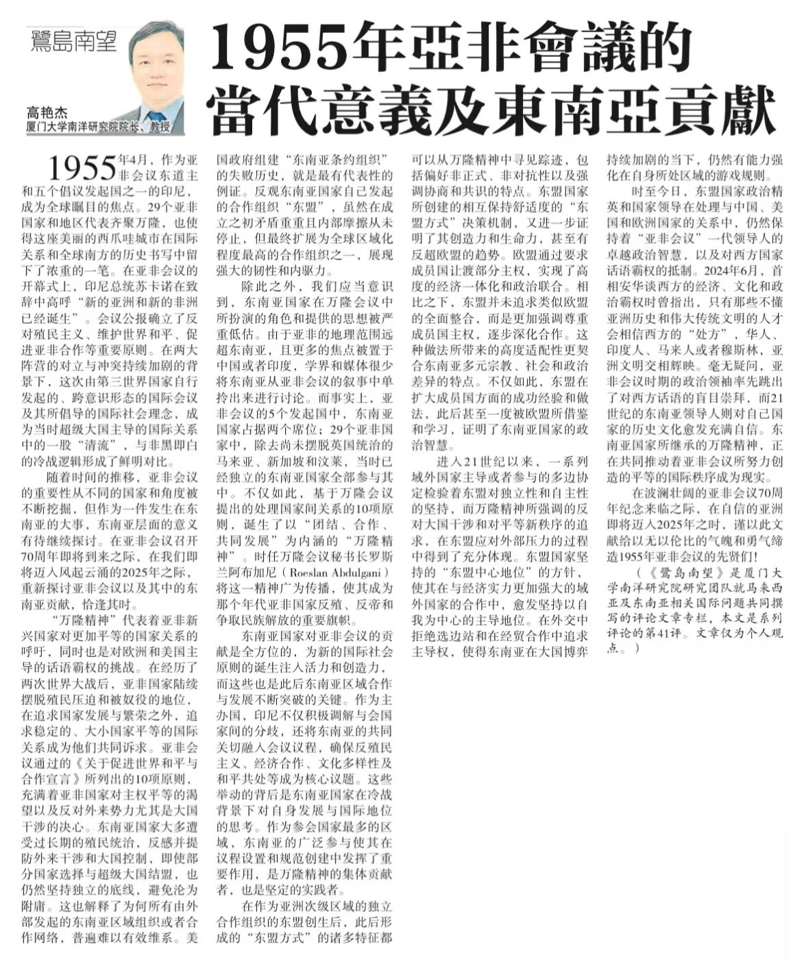 【星洲日报】《鹭岛南望》专栏:高艳杰|1955年亚非会议的当代意义及东南亚贡献