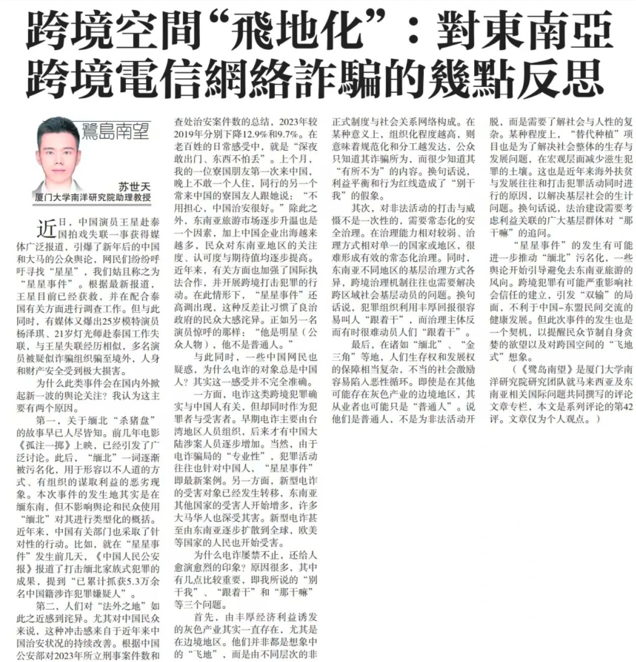 【星洲日报】《鹭岛南望》专栏:苏世天 | 跨境空间“飞地化”:对东南亚跨境电信网络诈骗的几点反思