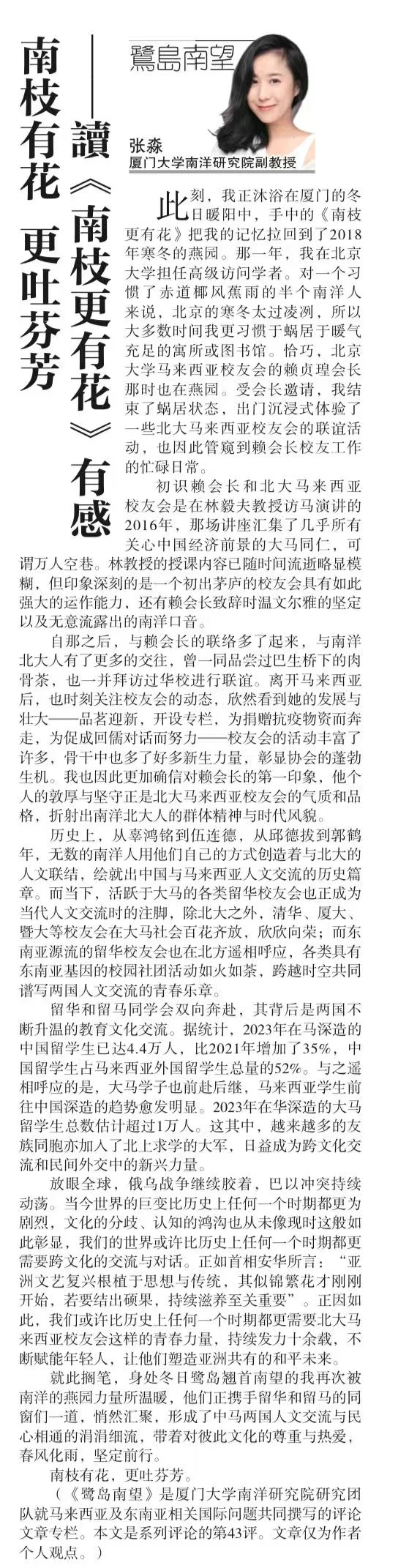 【星洲日报】《鹭岛南望》专栏:张淼 | 南枝有花 更吐芬芳——读《南枝更有花》有感