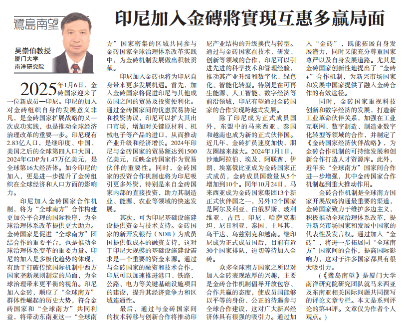 【星洲日报】《鹭岛南望》专栏:吴崇伯 | 印尼加入金砖将实现互惠多赢局面