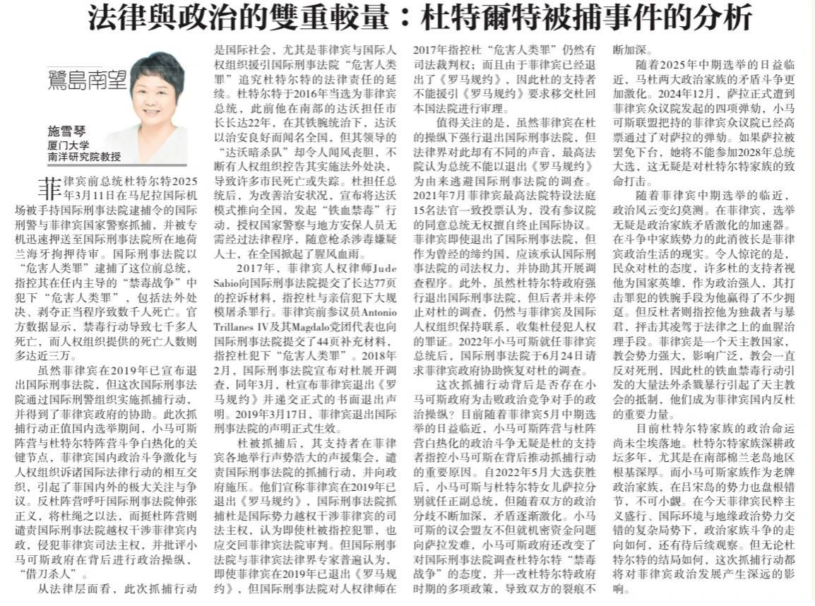 【星洲日报】《鹭岛南望》专栏:施雪琴 | 法律與政治的雙重較量:杜特爾特被捕事件的分析