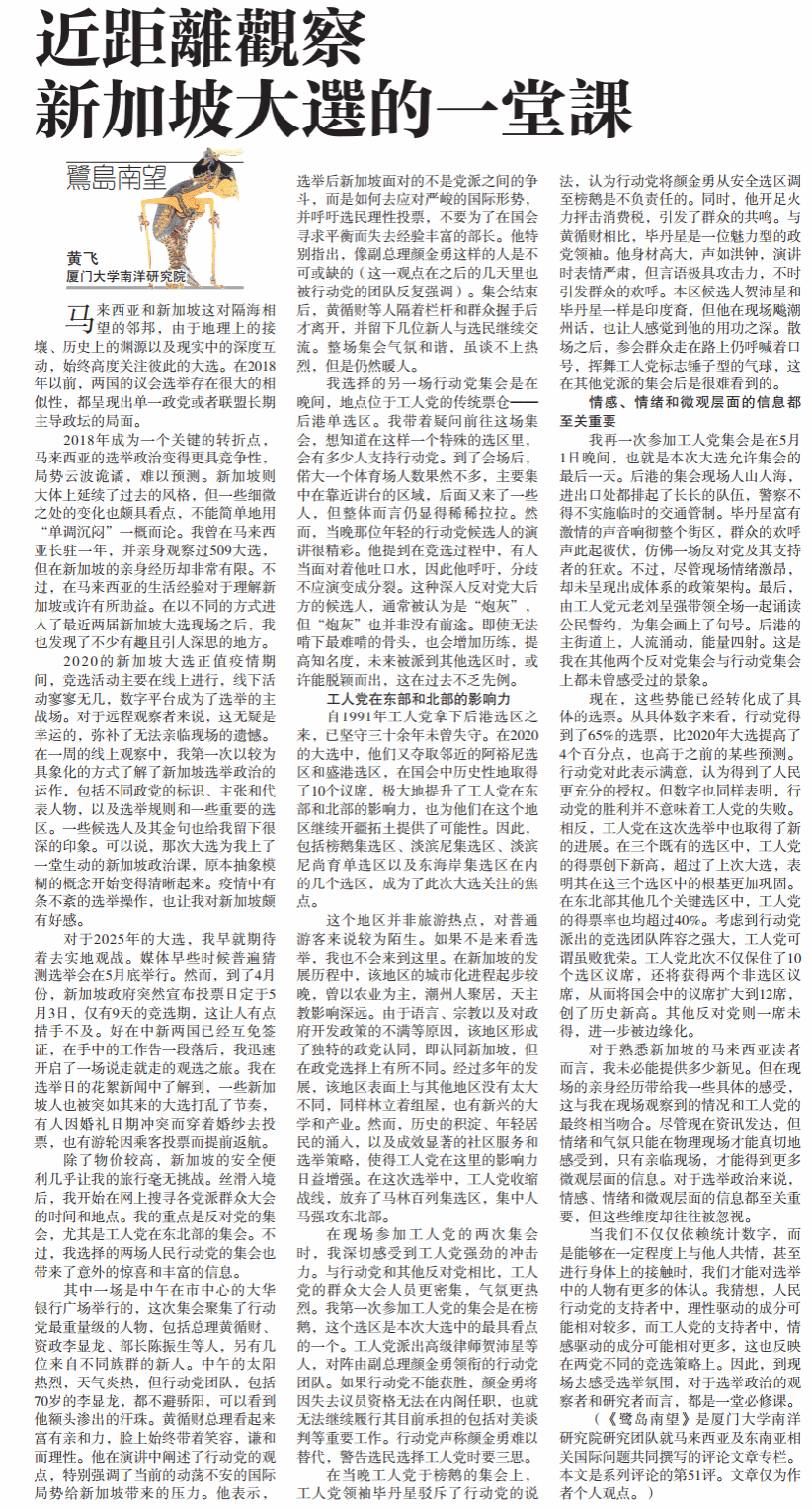 【星洲日报】《鹭岛南望》专栏:黄飞 | 近距离观察新加坡大选的一堂课