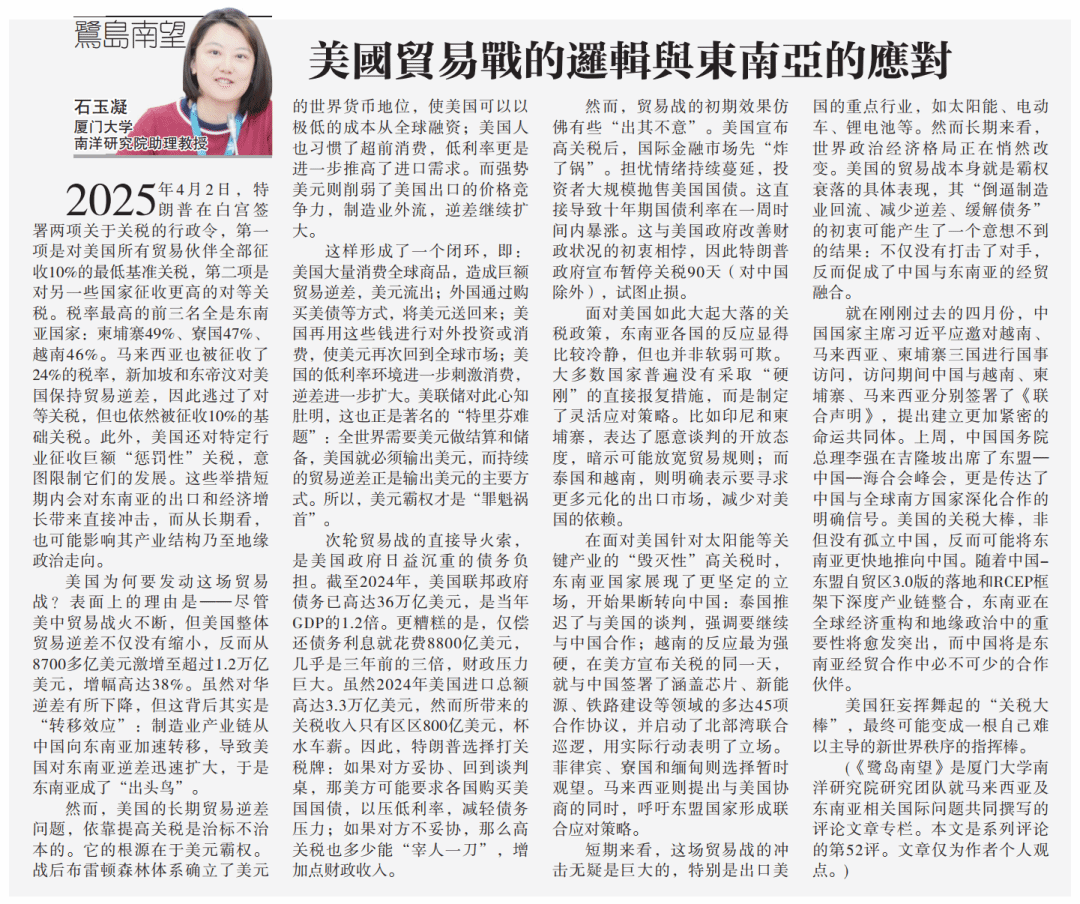 【星洲日报】《鹭岛南望》专栏:石玉凝 | 美国贸易战的逻辑与东南亚的应对