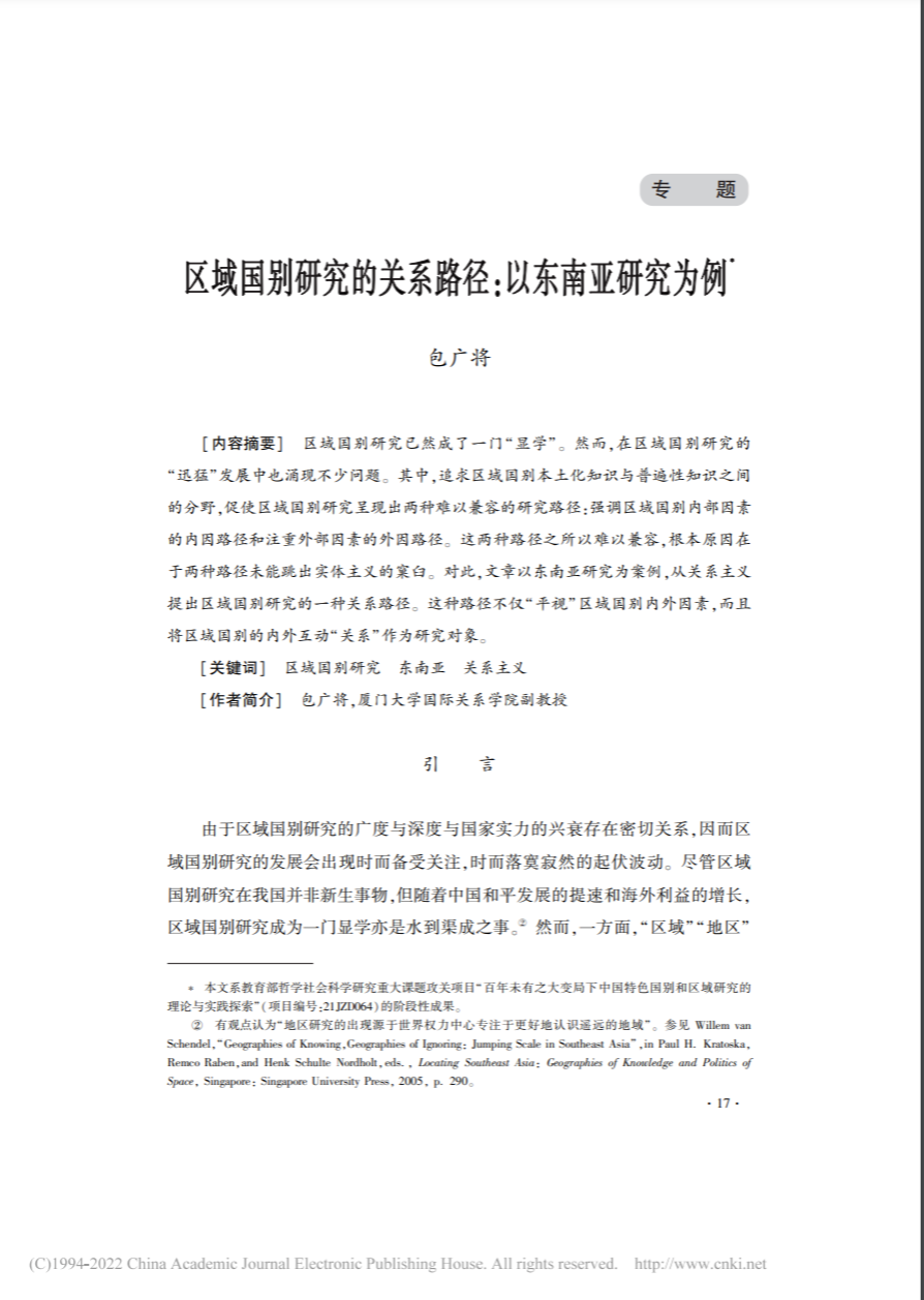【科研动态】印度尼西亚研究中心包广将老师发表论文《区域国别研究的关系路径:以东南亚研究为例》
