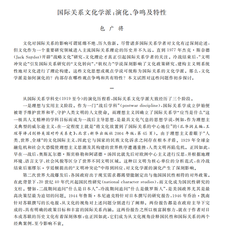 2021年1月,我所包广将老师在CSSCI来源刊物《史学月刊》发表文章《国际关系文化学派:演化、争鸣及特性》。文章对“国际关系文化学派是如何演化的内部”“存在哪些观点争鸣和共有特性”这些问题作初步探讨。
