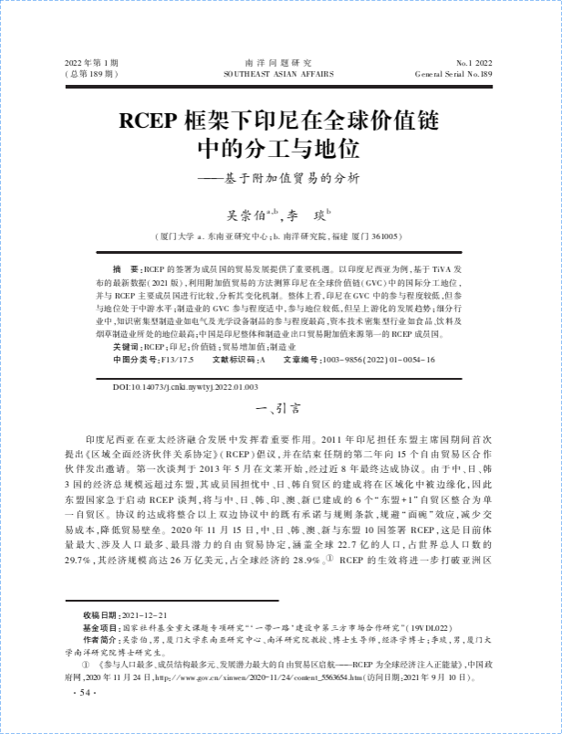 【科研动态】印度尼西亚研究中心吴崇伯老师发表论文《RCEP框架下印尼在全球价值链中的分工与地位——基于附加值贸易的分析》