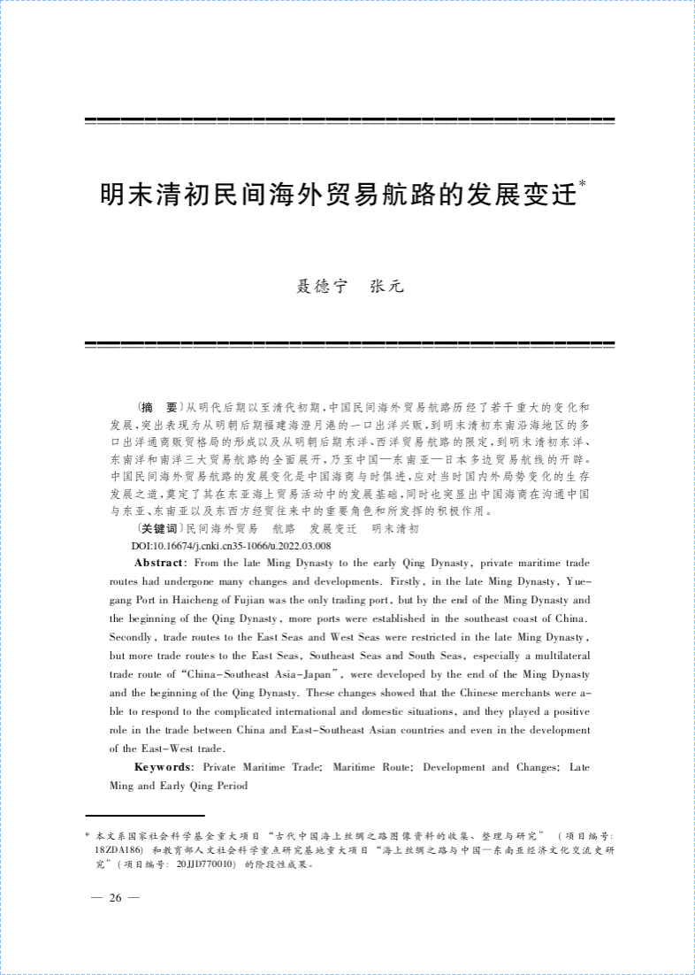 2022年9月,聂德宁老师在其他刊物《海交史研究》上发表论文《明末清初民间海外贸易航路的发展变迁》。文章时间定位于明代后期至清代初期,分析中国民间海外贸易航路出现的巨大变化,突出表现为从明朝后期福建海澄月港的一口出洋兴贩,到明末清初东南沿海地区的多口出洋通商贩贸格局的形成以及从明朝后期东洋、西洋贸易航路的限定,到明末清初东洋、 东南洋和南洋三大贸易航路的全面展开,乃至中国—东南亚—日本多边贸易航线的开辟。以分析为基点,探寻中国民间海外贸易航路的发展变化的重要性:奠定了其在东亚海上贸易活动中的发展基础,同时也突显出中国海商在沟通中国 与东亚、东南亚以及东西方经贸往来中的重要角色和所发挥的积极作用。