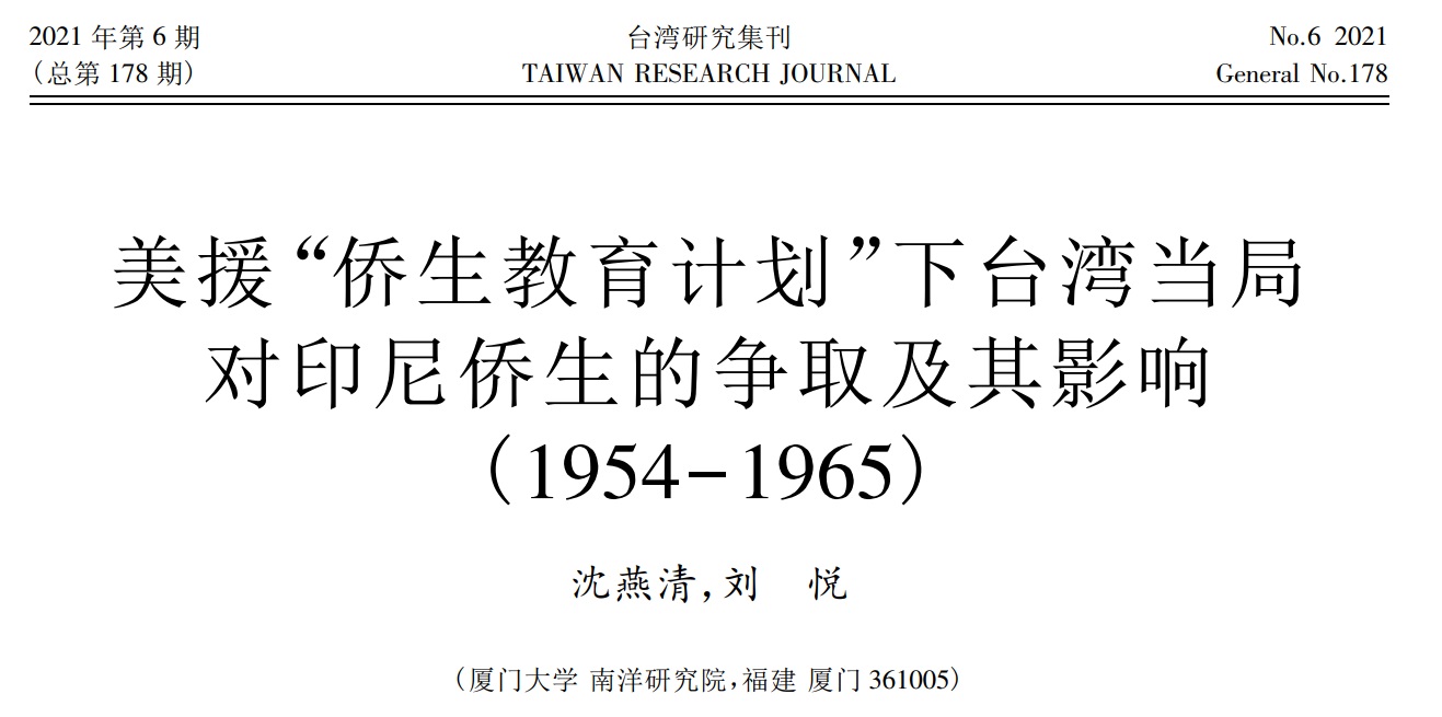 2021年12月,印尼研究中心沈燕清老师及其硕士毕业生刘悦,在《台湾研究集刊》上刊发《美援“侨生教育计划”下台湾当局对印尼侨生的争取及其影响(1954-1965)》一文。新中国成立后,大量东南亚侨生返回中国大陆求学。退守台湾的国民党当局坚持“无侨教即无侨务”的政策,极力鼓动侨生赴台升学。美国基于“反共”目的,也试图阻止海外侨生前往中国大陆升学。在美台共同利益的驱使下,1954-1965年间“美援侨生教育计划”出台并实施。文章指出,印尼因其地缘战略位置和地区影响力而在美援“侨生教育计划”中占据重要位置。由于该计划本身浓厚的政治色彩、印尼政府对华侨教育及侨生赴台的诸多限制、台湾政权合法性问题及中共对印尼侨生的争取与安置等因素的影响,台湾争取的印尼侨生的数量有限,但其政治意义不容忽视。