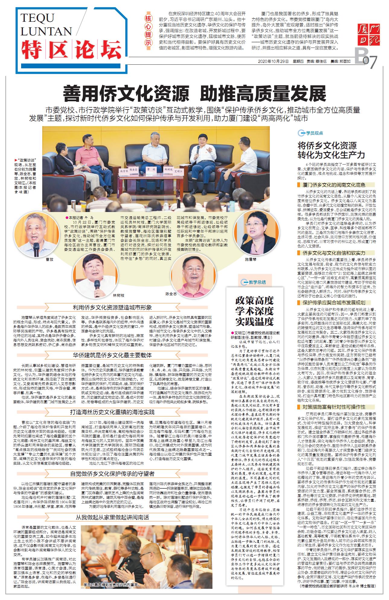 2020年10月22日厦门市委党校、市行政学院举行“政策访谈”互动式教学,围绕“保护传承侨乡文化,推动城市全方位高质量发展”主题,探讨新时代侨乡文化如何保护传承与开发利用,助力厦门建设“两高两化”城市,我中心施雪琴教授接受了访谈。在访谈中,施教授从学理角度阐述了侨乡文化的概念内涵、行程、特点与现代意义。她指出,侨乡文化具有鲜明的地域性、跨国性、多样性和包容性,体现了海外华侨对家乡位置文明与精神文明的双重贡献;侨乡文化在新时代依然具有重要的现实意义,它是城市文化资源的重要构成;我们应传承侨乡文化中的人文精神,活化利用侨乡文化遗产,助力美丽乡村建设。