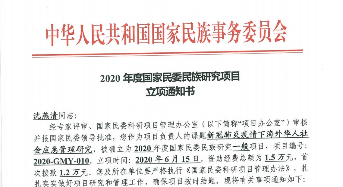 2020年6月1日,印尼研究中心沈燕清副教授获得国家民委民族问题研究项目立项。为深入贯彻关于中央关于新冠肺炎疫情防控的重要讲话和指示批示精神,助力打赢疫情防控阻击战,为民族地区经济社会发展提供智力支持,国家民委在民族研究项目2020年度课题原有选题的基础上,增补“新冠肺炎疫情对民族工作的影响”研究专项。沈燕清副教授此次立项的题目为《新冠肺炎疫情下海外华人社会应急管理研究》。