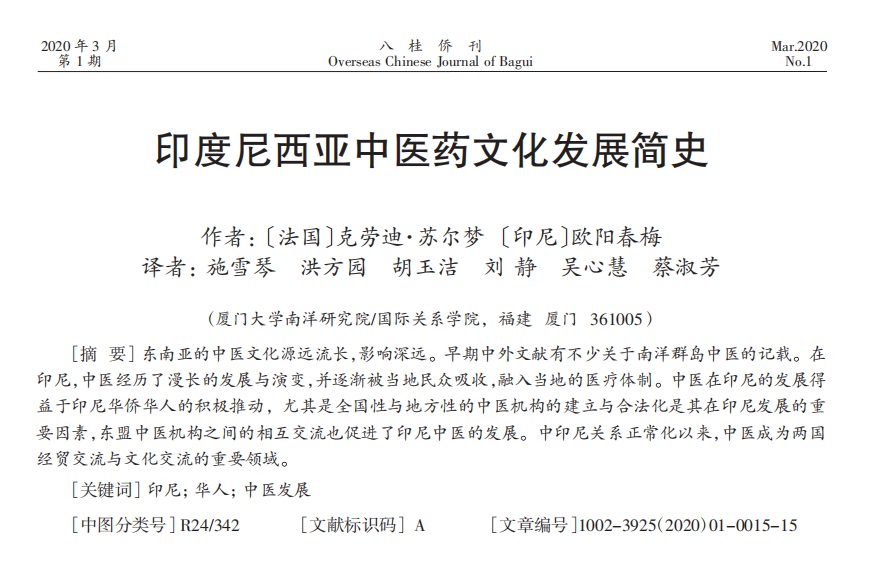 迄今为止,国内外学者对中医药在印尼的传播与发展的系统性研究并不多见,我中心施雪琴教授带领学生将法国知名学者克劳迪·苏尔梦及印尼学者欧阳春梅合著的论文《印度尼西亚中医药文化发展简史》翻译成中文,刊载于《八桂侨刊》2020年第1期,在我国大力推动中医药文化的发展及全球抗击新冠肺炎疫情的背景下无疑具有重要的学术意义与现实意义。