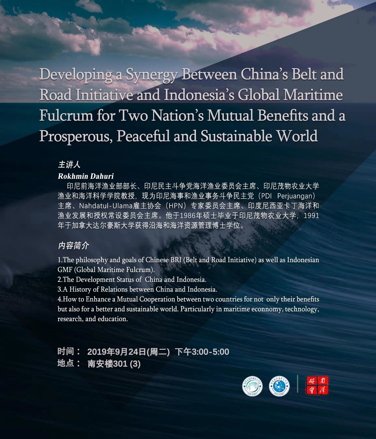 2019年9月24日下午,在我院301(3)教室,印尼前海洋渔业部部长、茂物农业大学渔业和海洋科学学院Rokhmin Dahuri教授为我院师生作了一场题为“Developing a Synergy Between China’s Belt and Road Initiative and Indonesia’s Global Maritime Fulcrum for Two Nation’s Mutual Benefits and a Prosperous, Peaceful and Sustainable World”的专题讲座。此次讲座由印尼研究中心协办,讲座围绕世界经济和人类文明的历史发展、全球化时代面临的问题和挑战、中国与印尼的关系史、中国的“一带一路”倡议、印尼的全球海洋支点战略构想等八个专题展开。在Rokhmin Dahuri教授发言完毕后,现场师生展开积极讨论,大家踊跃发言,气氛热烈。最后,印尼研究中心教授、我院副院长吴崇伯老师代表我院和印尼研究中心向Rokhmin Dahuri教授赠礼致谢。
