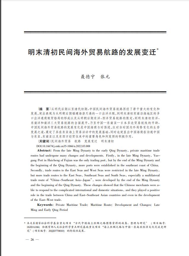 2022年9月,聂德宁老师在期刊《海交史研究》发表文章《明末清初民间海外贸易航路的发展变迁》。文章梳理了从明代末年到清朝初期中国民间海外贸易航路经历的若干重大变化和发展。中国民间海外贸易航路的发展变化是中国海商与时俱进,应对当时国内外局势变化的生存 发展之道,奠定了其在东亚海上贸易活动中的发展基础,同时也突显出中国海商在沟通中国与东亚、东南亚以及东西方经贸往来中的重要角色和所发挥的积极作用。