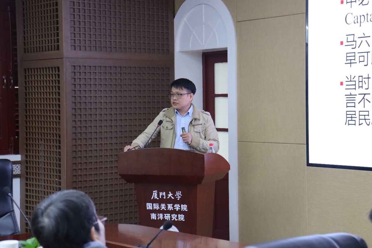 2024年12月18日上午,南洋问题与全球视野系列讲座第六十一讲、华侨华人与国际移民系列⑤在厦门大学南安楼301-3会议室举行。本次讲座特邀马来西亚华社研究中心研究员阮湧俰博士担任主讲人,主题为“马六甲华人甲必丹的历史重构与田野新发现”。阮湧俰博士研究方向与兴趣为马来西亚华人史、马来西亚国家历史档案、华人甲必丹、华人碾米业、华人族谱等。出版成果有《槟榔屿志略校注》(与聂德宁教授合作完成),目前主要负责执行马来西亚华社研究中心的旗舰项目—“雪隆华人方言帮群国家档案出版计划”的研究工作。