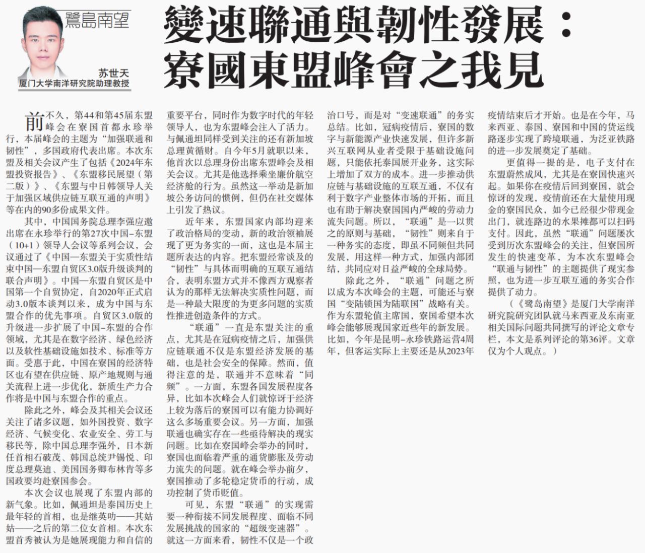 【星洲日报】《鹭岛南望》专栏:苏世天|变速联通与韧性发展:寮国东盟峰会之我见