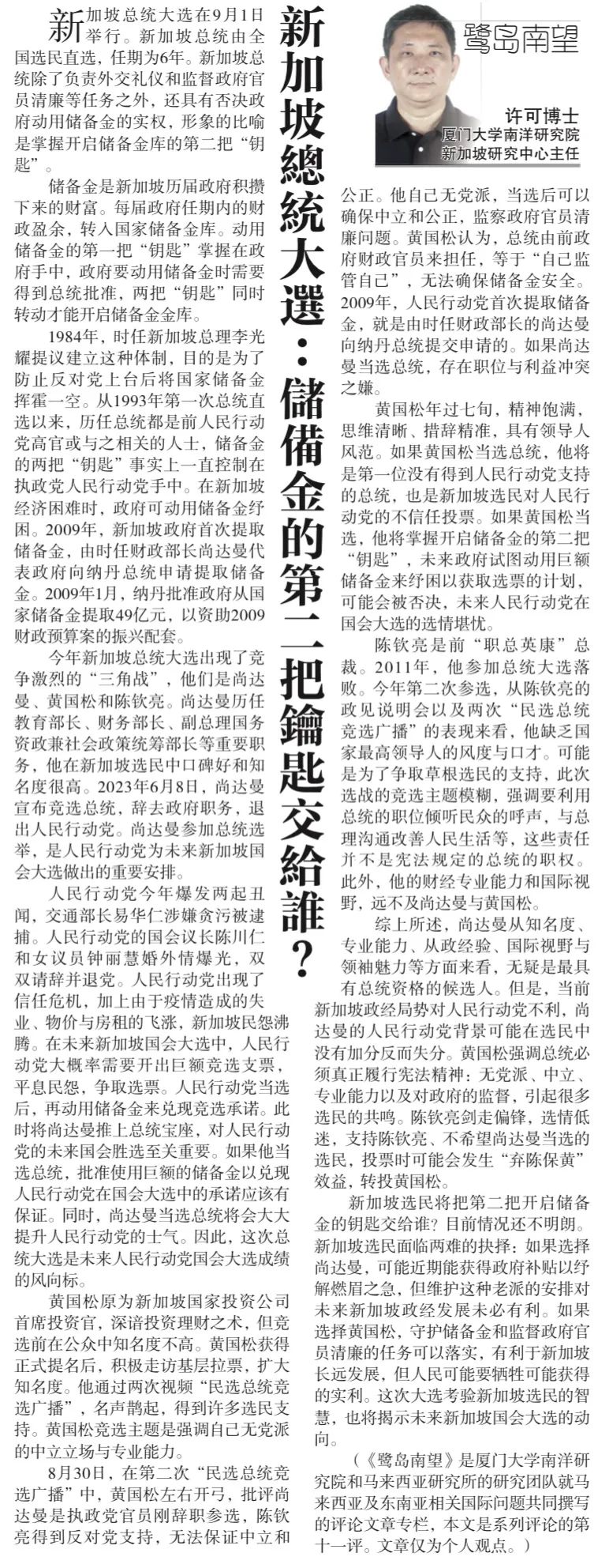 【星洲日报】《鹭岛南望》专栏:许可 | 新加坡总统大选:储备金的第二把钥匙交给谁?