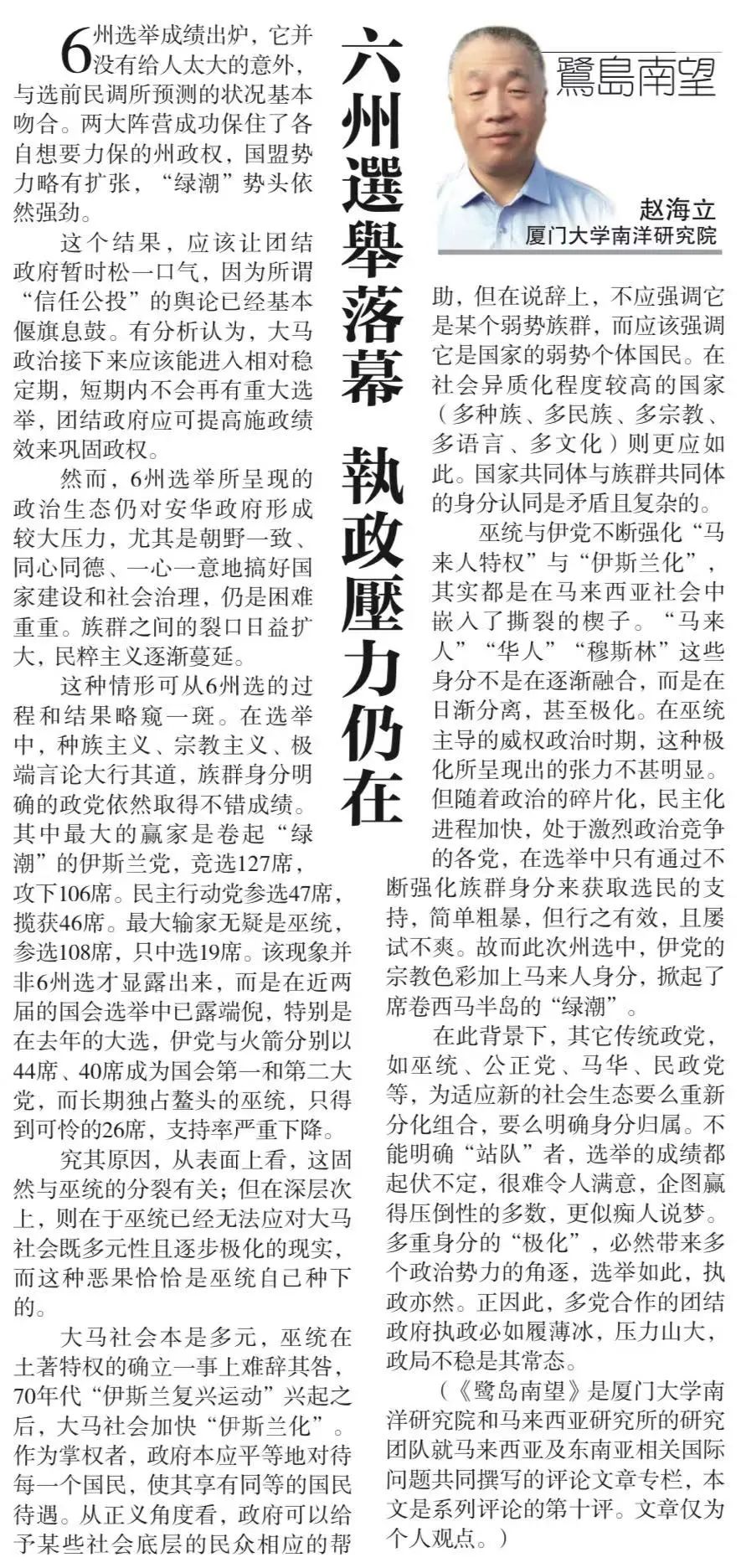 【星洲日报】《鹭岛南望》专栏:赵海立 | 六州选举落幕 执政压力仍在