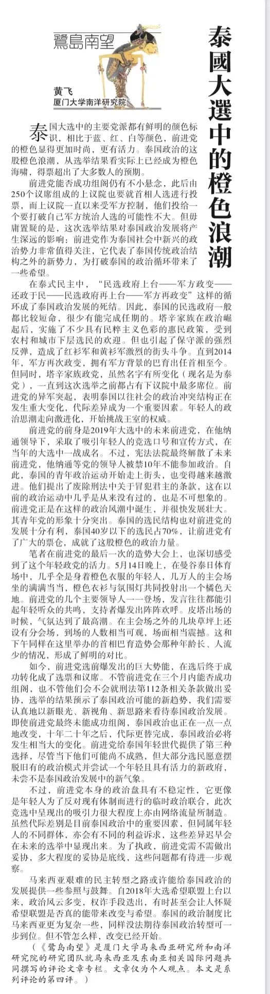 【星洲日报】《鹭岛南望》专栏:黄飞|泰国大选中的橙色浪潮